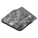 Os ornamentos de esfera de Disco de vários tamanhos formam uma pilha caótica nesta única fotografia em preto e branco. As bolas de espelhos brilhantes refletem sombras claras ou escuras de cada uma de suas pequenas facetas espelhadas. Os ornamentos da bola reluzente descansam em cima das terras com miçangas dodecaedro prateadas refletoras. Fotografia digital, preta e branca. Copyright © 2013 Claire E. Skinner. Todos os direitos reservados.