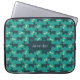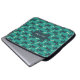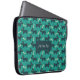 Bolsa de laptop desenhada com um padrão repetitivo que apresenta um sorriso fofo com orelhas disquetes e um osso de cão. Fundo verde.