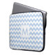 Proteja o seu laptop com uma manga neoprene divertida, com linhas alternadas de faixas de diafragma azul claro e branco, num padrão geométrico arejado, com um monograma personalizado dentro de um quadrado branco no centro. Personalize-o com a sua inicial na barra lateral. Outras bolsas de laptop também disponíveis. Para ver o design Light Blue e White Zigzag em outros itens, clique no link "Rocklawn Arts" abaixo. Imagem criada digitalmente. Copyright ©Claire E. Skinner. Todos os direitos reservados.