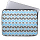 Esta bolsa de laptop apresenta um padrão geométrico colorido, herringbone, em azul, cinza escura e branco.