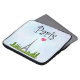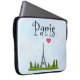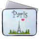 Bolsa de laptop com um desenho cômico da Torre Eiffel cercada por árvores verdes e coração cor-de-água rosa flutuando no ar.