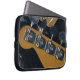 A imagem nesta Bolsa de laptop de 10" é uma fotografia original de ZoeSPEAK de pinos de afinação de guitarra em um baixo elétrico. Em tons de metal prateado, madeira loira e escuridão, a foto é uma vista de perto da parte de trás da cabeça do violão-baixo. Os quatro pinos de ajuste enchem a largura da imagem, e a madeira loira curvada do baixo se destaca em um fundo escuro. Há uma sugestão de um violão de chumbo semelhante atrás dos pinos, no topo da foto, e pisca a luz refletindo os pinos e outros instrumentos.