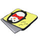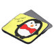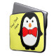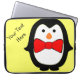 Saco de eletrônicos/saco de laptop amarelo com um pinguim bonito vestindo uma gravata vermelha de arco. O pinguim e o arco podem ser redimensionados e reposicionados. O texto, que está sendo executado verticalmente no lado esquerdo do gabinete, pode ser movido para outra posição se você escolher.
