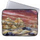 Uma paisagem alienígena de Marte com dunas de areia, pedras, rochas, montanhas e céu vermelho com nuvens de cirros finos.