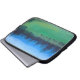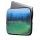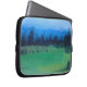 Esta bolsa de laptop única tem uma seção tirada de uma pintura original da paisagem impressa nela. A imagem assustadora da paisagem florestal de inverno cobrir toda a manga. A pequena paisagem colorida é uma pintura de aquarela original e está nas cores verde e azul. No céu vocês podem ver alguns pássaros voando acima da silhueta das árvores. Esta imagem original da floresta realmente se destaca nesta bolsa de laptop original.