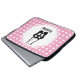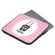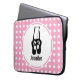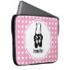 Bolsa de laptop com uma ilustração preta de um sapatilhão de dançarinas balés e suas pernas. Ballerina está de pé nos dedos dos pés, em ponto. Fundo é um padrão feito de bolinhas brancas em rosa.
