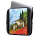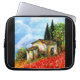 Paisagem da Toscana, beleza colorida, vibrante e expressiva dos campos rurais italianos e da papoila vermelha, bela flora de Verão em verde claro, amarelo, castanho, azul, branco, prados, campo de flores, cinza e oliveiras, antiga casa de fazenda rustica sob o céu azul e nuvens brancas. Pintura acrílica em canvas.