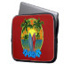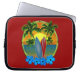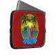 Por do sol bonito da praia atrás das prancha e das palmeiras, quadro com as flores do bambu e do hibiscus.