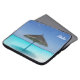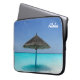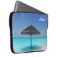 Bolsa de laptop com uma fotografia de uma praia de caribe tropical cênica. Uma praia branca arenosa e águas azuis cristais com um guarda-chuva compacto a solo. Secudido e sereno.