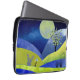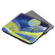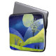 Uma paisagem de abstrato que representa colinas rolantes com primavera e plantas florescentes e uma lua e estrelas em tons de azul, ciano, amarelo e rosa.