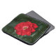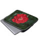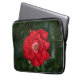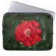 Uma fotografia de uma rosa vermelha num jardim. A flor está totalmente aberta expondo os caules amarelos do centro. Um par de botões vermelhos cresce atrás da flor principal. O fundo é cheio de folhas verdes. Imagem Copyright ©Kimberly J Tilley.