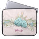 Uma bolsa de laptop personalizada desenhada com uma foto de rosas azuis cercada por galhos, folhas e bolhas de rico. As bolhas também formam uma forma de coroa. Flores brancas e arcos azuis bonito e fita branca de legado também rodeiam os rosas. Colocado sobre um fundo de mármore rosa empoeirado.