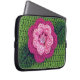 A imagem floral verde e cor-de-rosa impressa no saco de eletrônicos é a partir de uma fotografia de uma criação original feita à mão e Copyright © pelo designer publicado Delores Chamblin. A fotografia da única flor artesanal e das folhas com pontos visíveis e com um botão cor de pérola é reproduzida na viagem.