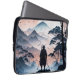 Esta imagem apresenta uma silhueta impressionante de um samurai parado em um pequeno monte no primeiro plano. O samurai é enfeitado com a armadura tradicional e segura uma espada em uma mão e uma lança na outra. Por trás da figura está uma paisagem expansiva com camadas de montanhas subindo à distância sob uma grande e pálida lua que fica baixa no céu. A cena é colocada contra um pano de fundo de um céu noturno que transita de matizes quentes perto do horizonte para tons mais frios acima. Intrair ramos de árvore enquadra o topo da imagem, acrescentando profundidade e detalhes a essa descrição serena, mas poderosa, da natureza e do espírito guerreiro.