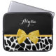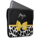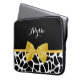 Uma bolsa de laptop de girafa branca e preta de tendência, impressão de 15'', com uma fita amarela de ouro cinza amarrada em um arco chic. Personalize este design de impressão na moda animal adicionando seu nome. Imagem impressa plana, não arco real.