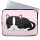 Capa personalizada de computador com uma ilustração adorável de um gatinho fofo bicolor tirando uma soneca em um fundo de corações e estampas de pata.
