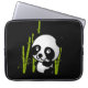Que bela e adorável ilustração de um urso panda preto e branco sentado entre as pedras verdes de bambu em um pequeno bosque, parecendo feliz, amigável e amoroso. Fundo preto.