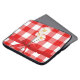 Buquê de margarida branca com fita vermelha e arco no padrão de xadrez de búfalo vermelho e branco.