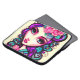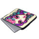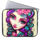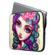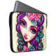 Esta é uma bolsa de laptop artística divertida, com uma ilustração caprichosa de uma menina roxa, rosa e turquesa sobre fundo amarelo-claro.