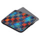 Xentrom riscos cruzados, de cor azul Escuro e riscos em azul claro e laranja com toneladas manchados avermelhados, e bordas secas nos traços que causar um percepção de sujo ou manchado.