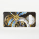 Marcações antigas com engrenagens de ouro e latão, decoradas com libélula mecânica sobre fundo castanho e listrado. Steampunk.