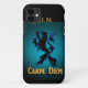capas de iphone "Carpe Diem" com Leão preto e dourado. "Agarre o dia". Personalize este caso com seu nome ou iniciais. Grifo mitológico sobre fundo azul e preto