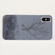 Uma paisagem 3D fria e ventosa no inverno, criada em Vue. Em cima de uma colina branca com gelo e neve, contra um céu de cinza tempestuoso com chuva ou manga caindo firmemente, uma árvore de bordo solitária e nua se posiciona com um banco de madeira embaixo dela.