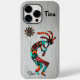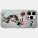Personalize esta Capa de telefone de células Kokopelli única "Um dos tipos"! Ele apresenta um Kokopelli sudoeste em Turquoise, Laranja e Negro tocando flauta e dançando sob o sol num fundo de prata! Design de Arte Gráfica Original criada pelo Artista Kerry Miller.
