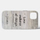 O amor suporta todas as coisas, com nome ou monograma pronto para atualizar. Uma citação eterno da bíblia sobre a resistência do amor é emparelhada com um design de madeira angustiado baseado na foto de uma verdadeira mesa de madeira. A mesa na imagem durou anos de tempo e uso, e tem as rachaduras e a cor esmaecida da cinza como resultado. Uma metáfora adequada para a natureza duradoura do amor. Citação do Primeiro Corinthians. A design de madeira parece legal e envolve os lados do gabinete nesta disposição. Também disponível em listagem separada para iPhone XR.