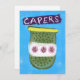 Um boião bonito e colorido de capers sobre um fundo texturizado azul com sotaques de flores e texto desenhado à mão.