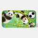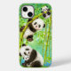 Animais Panda Capa de telefone Bonita Para o iPhone 14 Plus Case da Apple A mãe Panda é uma pequena família feita de três filhotes muito bonitos. O filhote mais pequeno está nos braços da mãe enquanto os outros dois estão tocando no tapete de bambu. Tem um fundo verde muito bonito.