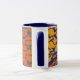 Caneca branca com jante azul escura e alça, decorada com peixes laranja impressos com tela sobre fundo azul escuro