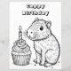 Cute coloring page with a with a cute capybara and a cupcake with the silly pun "Cappy Birthday."