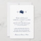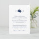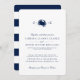 Um conjunto de convites de casamento com um caranguejo azul marinho entre a noiva e as iniciais do noivo em direção ao topo. Abaixo, está um texto cor de marinho que descreve os detalhes do seu dia especial sobre um pano de fundo branco. No verso do convite estão as faixas náuticas em negrito.
