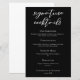 Esta lista de coquetéis com assinatura chic black apresenta uma tipografia branca simples da lista de bebidas e ingredientes para o bar do seu casamento. Um cardápio de bebidas moderno e minimalista para uma recepção com old fashioned, cosmopolitan, moscow mule e margarita. Deixe ou troque por seu coquetel favorito.