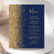 A borda esquerda deste elegante cardápio de casamento moderno apresenta uma borda de glitter dourado falso. O texto personalizável combina fontes de escrita à mão caprichosas douradas e fontes copperplate em um fundo azul marinho. O verso apresenta um design correspondente em azul marinho e glitter dourado.