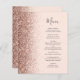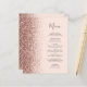 A borda esquerda deste elegante cardápio de casamento moderno apresenta uma falsa borda de brilho rosa dourado. O texto personalizável combina fontes de caligrafia manuscrita caprichosa cinza carvão e cobre em um fundo rosa bege. O verso apresenta um design correspondente de brilho rosa e dourado.