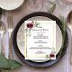 Um cartão de menu de casamento elegante no estilo boêmio. Penas e rosas aquareladas exuberantes em borgonha. Modelos para seus nomes, data e menu de casamento. Uma moldura em dourado falso e um fundo branco chic na frente, borgonha no verso. Letras coloridas em borgonha.