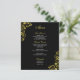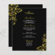 Uma forma elegante de mostrar o cardápio do seu casamento para todos os convidados. Uma lista que mostra as opções de primeiro prato, segundo prato e sobremesa. O verso tem uma mensagem pessoal sua junto com seus nomes e data do casamento. Um cardápio preto dramático com redemoinhos e flores em folha de ouro falsa.