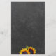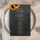 Menu Elegante de recepção de casamento rústica com um belo buquê de girassóis sobre fundo do quadro negro de cinzas. Ideal para o seu verão ou outono caem num elegante jardim russo do campo ao ar livre casamentos temáticos.