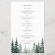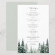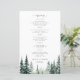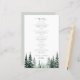 Modelo de cardápio de casamento rústico moderno elegante com tipografia moderna, natureza trendy, verde-sage, árvore de pinheiro, floresta, destino, orçamento, acessível, apresentando um script de caligrafia chic e árvores de pinheiro em aquarela na floresta.