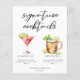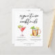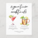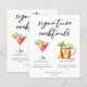 Esta folha de cardápio de drinks sofisticados apresenta tipografia preta simples acima de 2 de seus drinks favoritos e seus ingredientes para o bar do seu casamento à beira-mar. Um desenho chic de Cosmopolitan e Moscow Mule adiciona um toque divertido ao seu cardápio de bar. Completo com os nomes do casal e data da recepção.