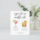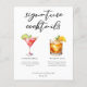 Esta lista sofisticada de coquetéis apresenta tipografia preta simples acima de 2 de seus drinks favoritos e seus ingredientes para o bar de casamento à beira-mar. Um Cosmopolitan chique e Whiskey Sour trazem um toque divertido ao cardápio do bar. Completo com os nomes do casal e data da recepção.