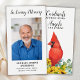 Watercolor Cardinal e Girassóis com eucalipto Simpatia de Oração Funeral Cartões de Oração Funerários. Este moderno, mas elegante cartão de oração memorial apresenta um pássaro cardeal vermelho num buquê de girassóis. Frente "In Loving Memory" Personalize este cartão de oração do funeral memorial com a foto, o nome e as datas de seus entes queridos e o sentimento. Voltar ~ Cardinais aparecem quando os anjos estão próximos. Este cartão de oração memorável será um guardião precioso, para os serviços funerários e para a celebração de eventos de vida. COPYRIGHT © 2020 Judy Burrows, Black Dog Art - Todos Os Direitos Reservados. Cardeal Memorial Funeral Prayer Card com Foto