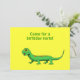Estes convites de aniversário de répteis têm um lindo lagarto verde na frente. Tem manchas amarelas e laranja e uma língua vermelha destacando-se.