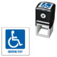 Sinal de acessibilidade. Símbolo da cadeira de rodas. Homem branco estilizado numa cadeira de rodas. Fundo azul. Custom Text.