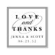 Adicione um encanto aos seus favores de casamento, obrigado cartas e muito mais com o nosso carimbo de casamento personalizado. Design apresenta "Amor e Obrigados" em uma mistura de blocos e tipos de caligrafia junto com seus nomes e data de casamento dentro de um quadro quadrado elegante.