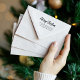Um simples carimbo de endereço na moda para devolução para os seus cartões de cartões de natal. As palavras "Feliz Natal" aparecem em um roteiro elegante de caligrafia manuscrita. Adicione seu nome e endereço em sans serif preto.
