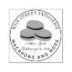 Ilustração do logotipo circular com três macarões franceses no centro com texto personalizado para endereço comercial, slogan e nome.