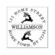 Um design de selo personalizado circular com duas renas saltitantes acima e abaixo do seu nome familiar e rodeado pelos detalhes do seu endereço. Ideal para adicionar um toque extra estampado nos seus cartões de natal.